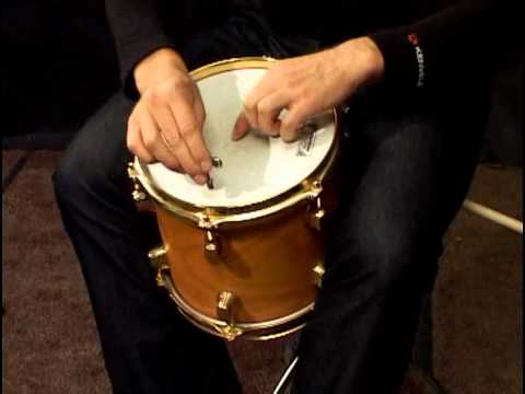 Настройку следует производить не на стойке, а держа барабан на колене или на полу (на мягком покрытии). После установки пластика нужно затянуть болты, чтоб он был хорошо натянут. Причем, затягивать нужно противоположные болты, делая равные небольшие обороты. Еще можно немного придавить его ладонью в центре.